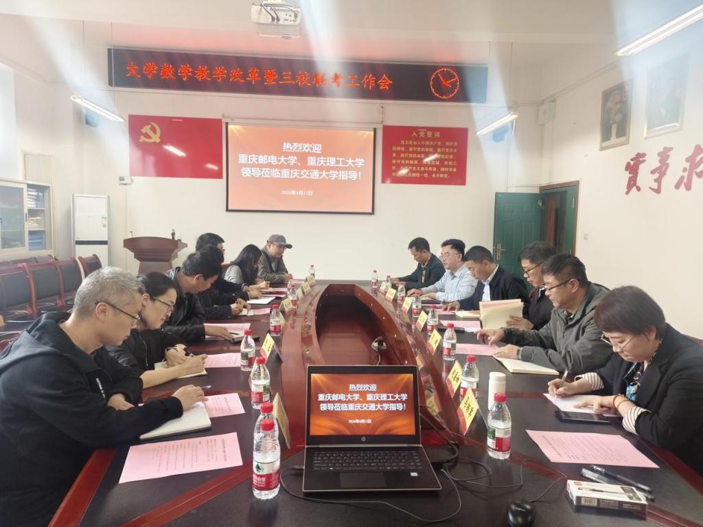 为深入推进大学数学课程教学改革,提升课堂教学质量,促进校际教学资源共享,2026年4月13日下午,大学数学教学改革暨三校联考工作会议在重庆交通大学南岸校区第二教学楼顺利召开。重庆交通大学、重庆邮电大学、重庆理工大学三校数学相关学院负责人、教学团队骨干及教务处相关领导参会,会议由重庆交通大学数学与统计学院副院长谭远顺主持。