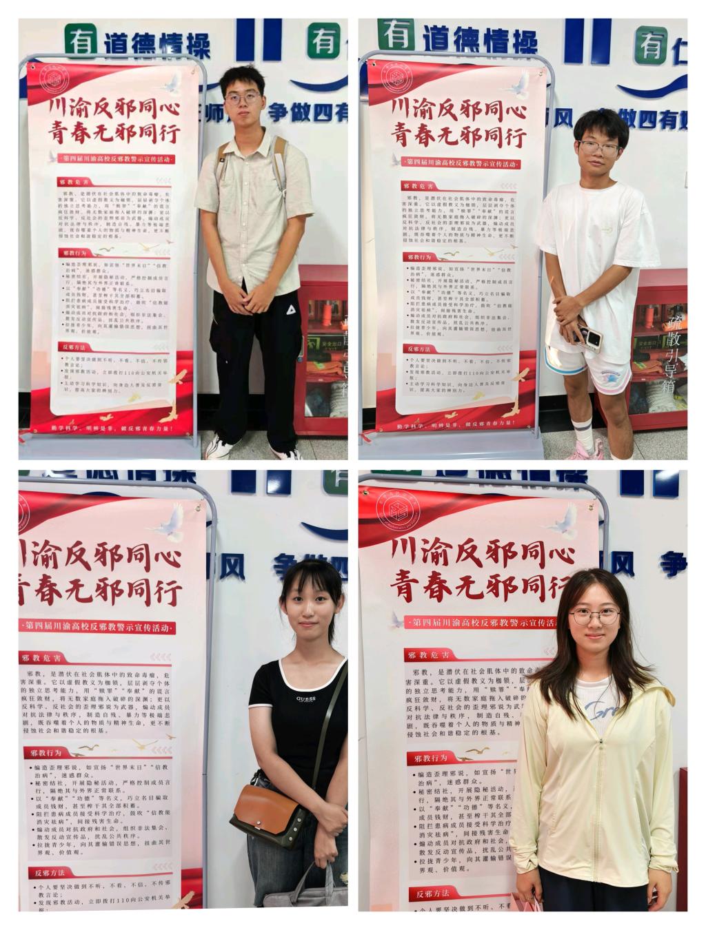 10月11日至14日,学院在致远楼四楼举办“反邪教宣传海报打卡”活动,学生们积极参与。学生们认真观看“邪教危害、科学常识、反邪倡议”主题海报并合影打卡,将反邪认知转化为主动行为。同时,学院开展了“反邪诗歌朗诵”活动。大一新生们通过演绎《守正祛邪》等反邪作品,表达了对邪教的批判与对科学的尊崇,进一步加深了对邪教本质的认识,提升了反邪凝聚力。