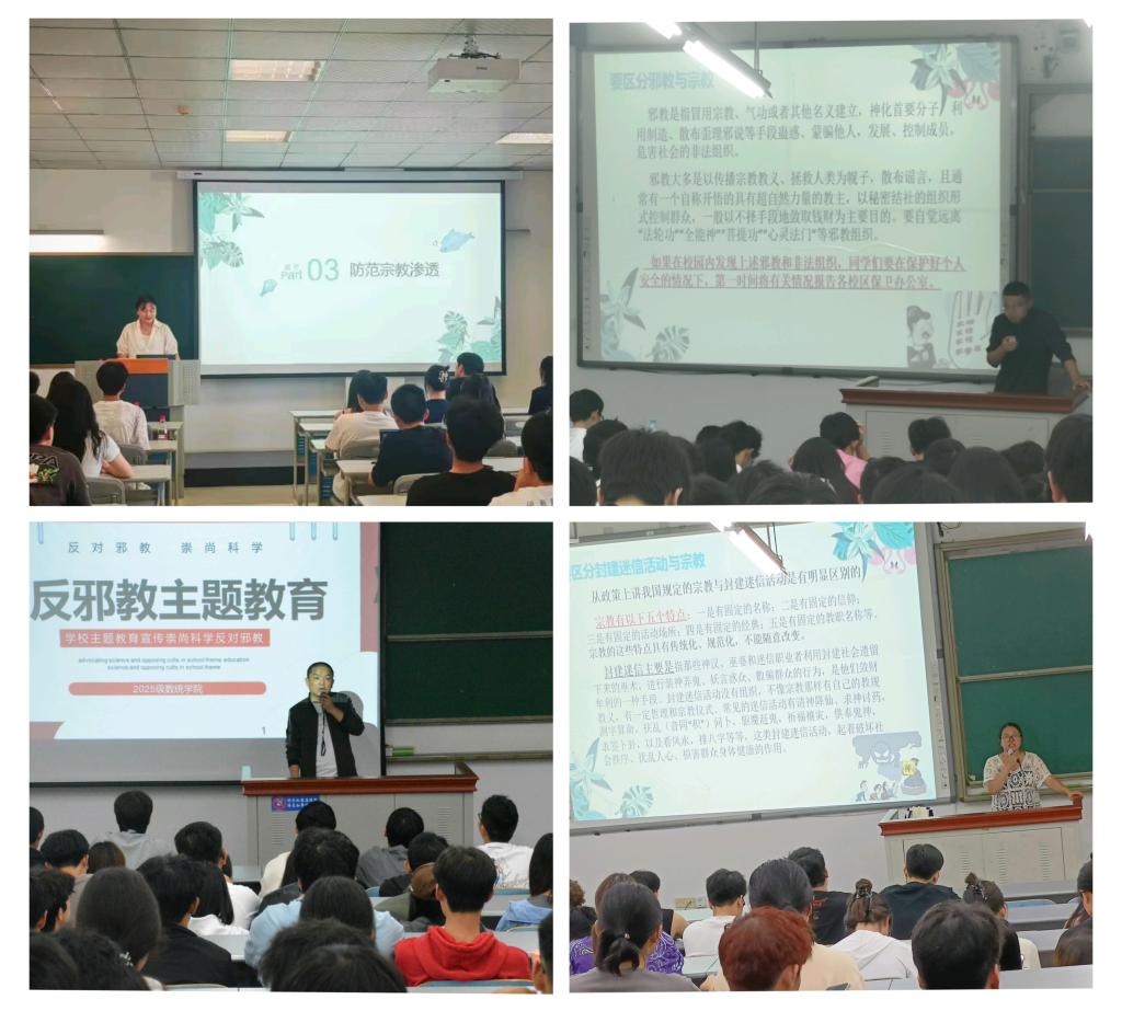 各年级辅导员面向学院全体学生开展反邪教警示教育。老师们结合真实案例,深入剖析邪教“迷惑心智、破坏家庭、危害社会”的三重危害。宣讲内容广泛,不仅包括相关法律法规解读,还涵盖识别邪教伪装、抵制邪教渗透的实用方法。活动贴近学生实际,兼具理论性与现实指导意义,有效传递了“崇尚科学、反对邪教”的理念,筑牢了学生思想“安全阀”。