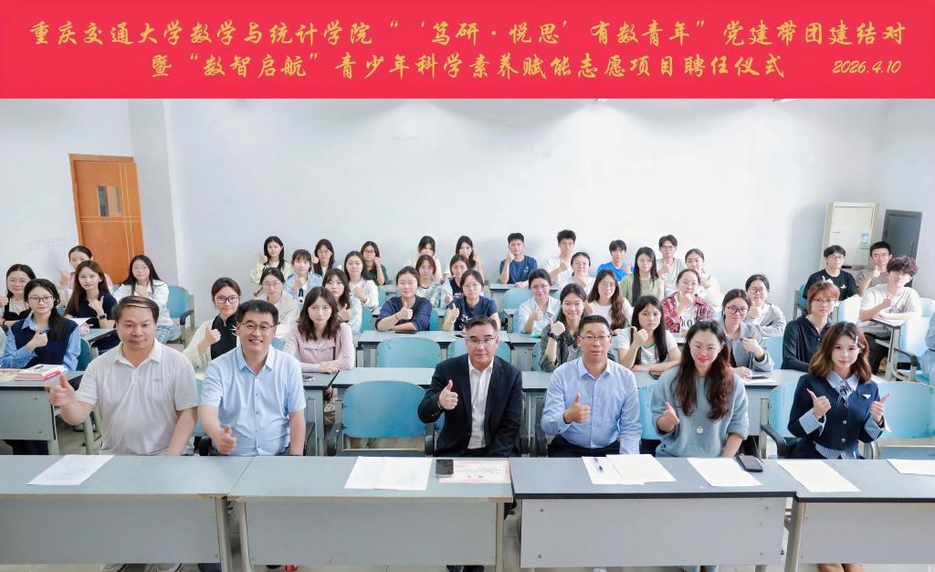 4月10日下午,重庆交通大学数学与统计学院在科学城校区隆重举行“‘笃研·悦思’ 有‘数’青年”党建带团建赋能共进结对暨“数智启航”青少年科学素养赋能志愿项目聘任仪式。此次活动作为第六届数学文化节的核心环节,恰逢学校建校75周年与“团队建设年”,其“党建引领、团队协作”的内核与学校正在开展的“七十五载·团队致远”主题教育活动形成呼应,标志着学校在基础学科人才培养与党建思政工作深度融合方面取得实质性进展。