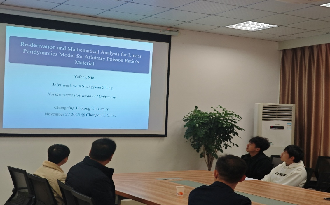 11月27日,西北工业大学数学与统计学院院长聂玉峰教授(国家级教学名师)应邀到访重庆交通大学,在科学城校区致远楼404会议室为数学与统计学院师生带来题为《任意泊松比材料线性近场动力学模型的再推导与数学分析》的学术报告。