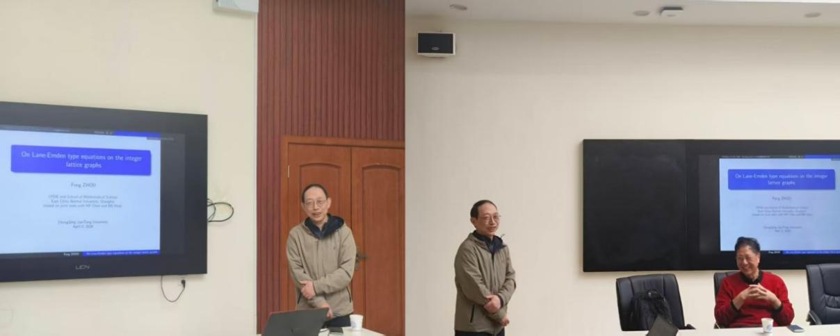 第二场报告,由华东师范大学周风教授主讲,题目为“On Lane-Emden type equations on the integer lattice graphs”。周风教授1985年公派留学法国,1993年获巴黎第六大学数学博士学位,曾任华东师范大学数学系主任,入选上海市曙光学者和优秀学科带头人。周教授的报告聚焦整数格点图上的Lane-Emden型方程,系统介绍了在Hardy形势函数条件下,方程在全空间、半空间和象限域等不同几何设定下的正解存在性与不存在性结果。他特别阐述了离散Sobolev指数与Serrin指数在图结构中的变化规律,展示了如何利用Birman-Schwinger算子和变分方法处理离散结构中的非线性问题,为连续偏微分方程的离散化研究提供了新视角。