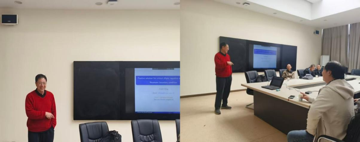 第一场报告,华中师范大学邓引斌教授做了题目为“Positive solutions for critical elliptic equation with critical Neumann boundary condition”的学术报告。邓引斌教授是偏微分方程领域的知名专家,长期从事含临界增长的椭圆方程、拟线性薛定谔方程等研究,曾获教育部自然科学奖二等奖和湖北省自然科学奖一等奖。报告中,邓教授深入探讨了带有临界Neumann边界条件的p-Laplacian方程正解的存在性与不存在性问题,介绍了利用Brezis-Nirenberg变分方法获得的最新研究成果,并详细分析了涉及临界Sobolev常数的极值函数性质。该研究回应了Haim Brezis于1987年提出的关于非线性边界条件椭圆方程的公开问题,具有重要的理论价值。