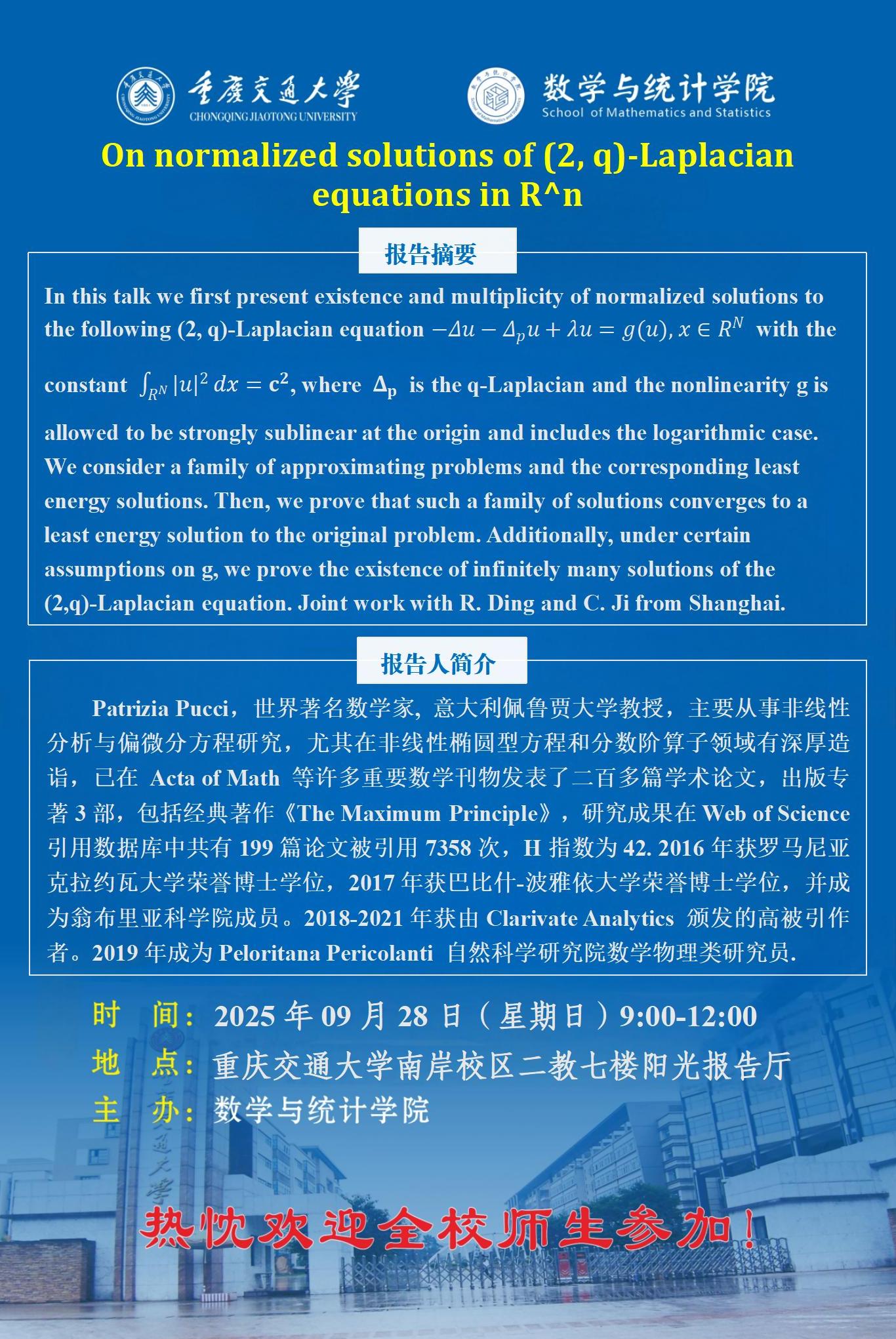 学术报告:On normalized solutions of [2, q)-Laplacian equations in R^n