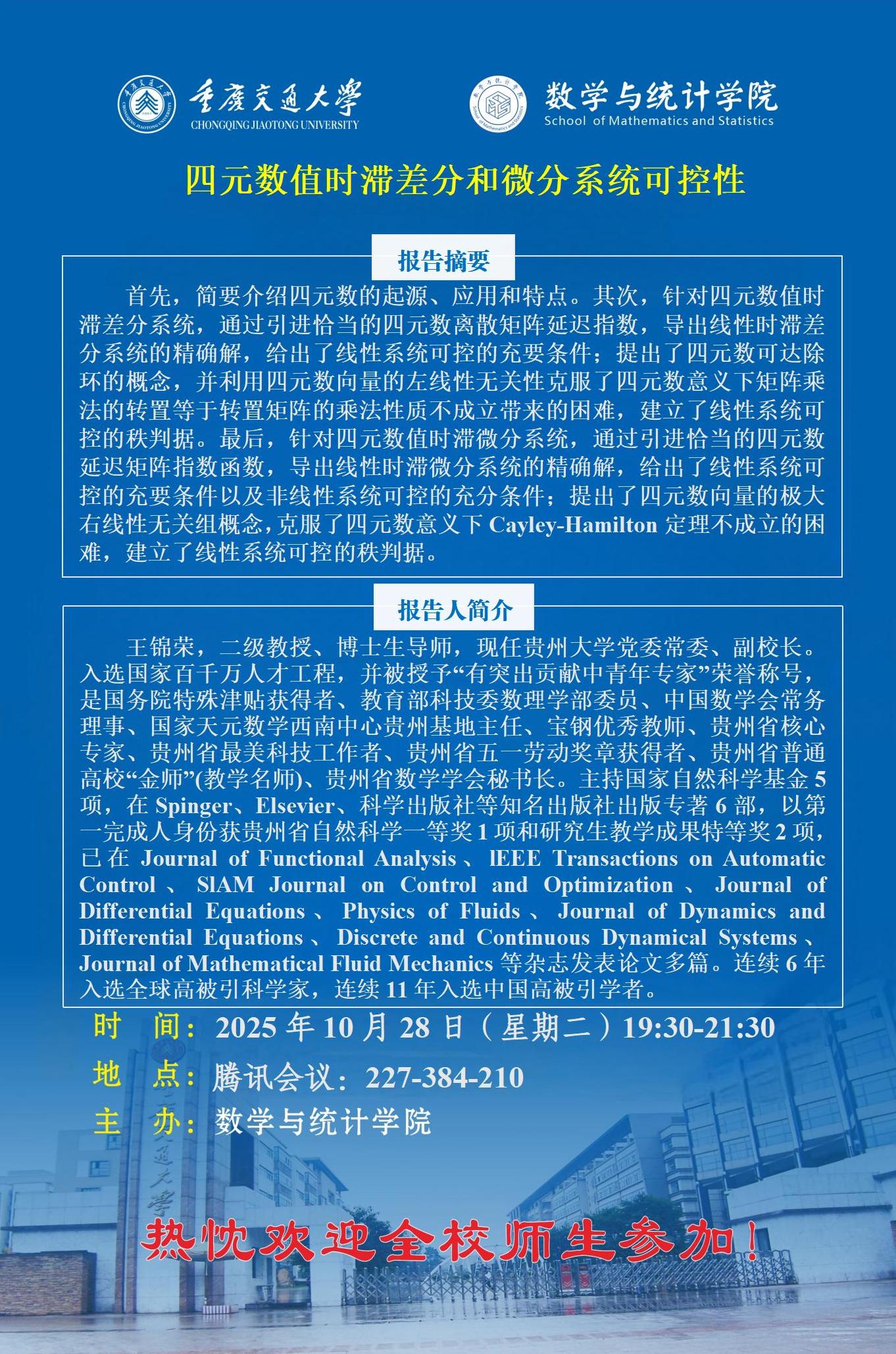 学术报告:四元数值时滞差分和微分系统可控性