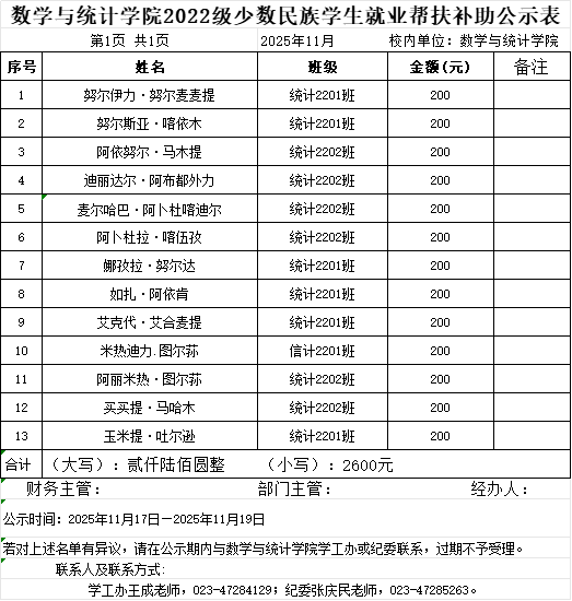 数学与统计学院2022级少数民族学生就业帮扶补助公示表