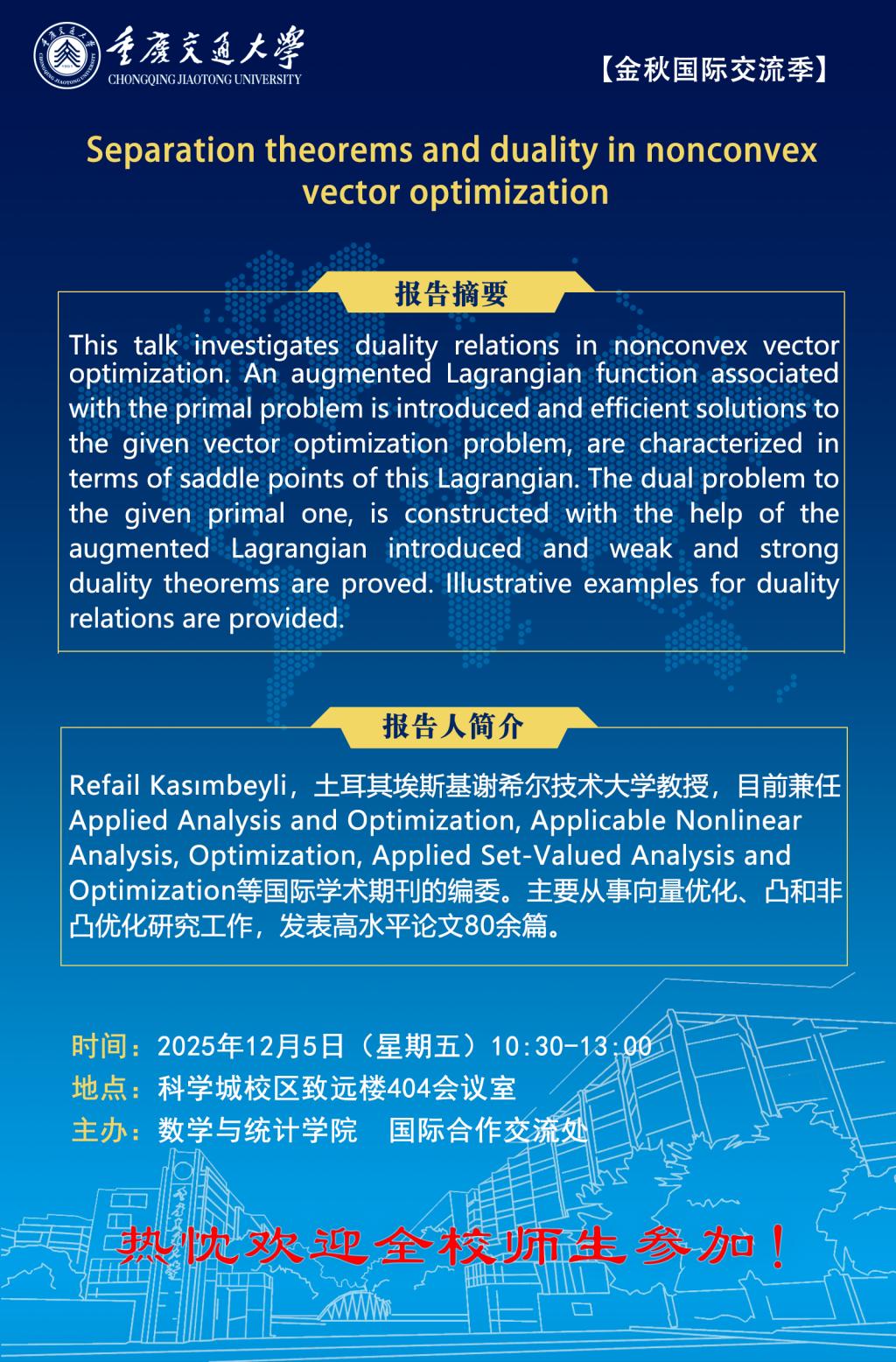 学术报告:Separation theorems and duality in nonconvex vector optimization