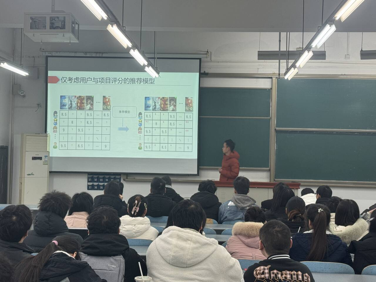 2025年12月24日,重庆交通大学数学与统计学院“双福·行远”系列讲座在科学城校区开讲。本次讲座聚焦“基于扩散模型的自监督知识图谱推荐方法前沿动态”,由学院杨明明博士主讲,信息与计算科学专业师生代表聆听。杨明明结合自身研究,系统解读主题核心要义、技术内核及前沿方向,搭建起人工智能与数据挖掘领域学术交流桥梁,现场氛围热烈。