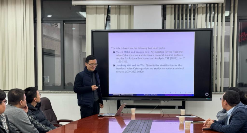 研讨会上半场环节由深圳大学杜力力教授主持。武汉大学王克磊教授以“Quantitative estimates and asymptotics for fractional Allen-Cahn equation”为题作了学术分享。报告介绍了分数阶Allen-Cahn方程奇异极限问题的最新研究进展,利用 Cheeger-Naber 和 Naber-Valtorta 发展的定量分层理论,给出了分数阶 Allen-Cahn 方程过渡层的精确估计,探讨了相关问题的研究现状与发展方向。
