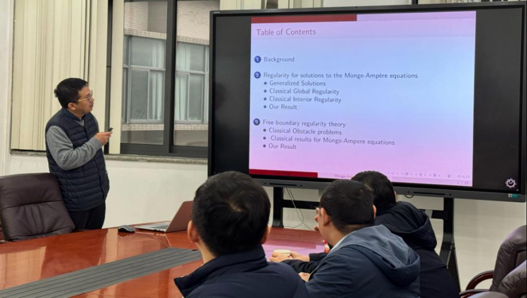 研讨会下半场环节由北京工商大学刘勇教授主持。华中师范大学唐岚教授以“On the Monge-Ampere equations”为题作报告,重点介绍了其团队在Monge-Ampère方程正则性理论研究方面的系列进展,内容涵盖退化Monge-Ampère方程广义解的整体正则性,以及一类障碍问题中自由边界的正则性结果。