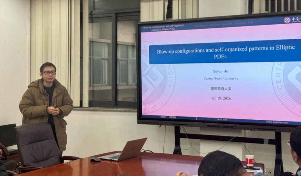 中南大学胡烨耀教授作了题为“Blow-up configurations and self-organized patterns in Elliptic PDEs”的学术报告,从多种物理模型中的自组织涡旋现象入手,介绍了一个在单位圆盘上同时考虑边界与内部涡旋的典型能量泛函模型,系统汇报了关于不同边界涡旋数量下能量极小化构型的分类研究成果,并探讨了边界涡旋数量趋于无穷时的极限变分问题及其最优分布规律。